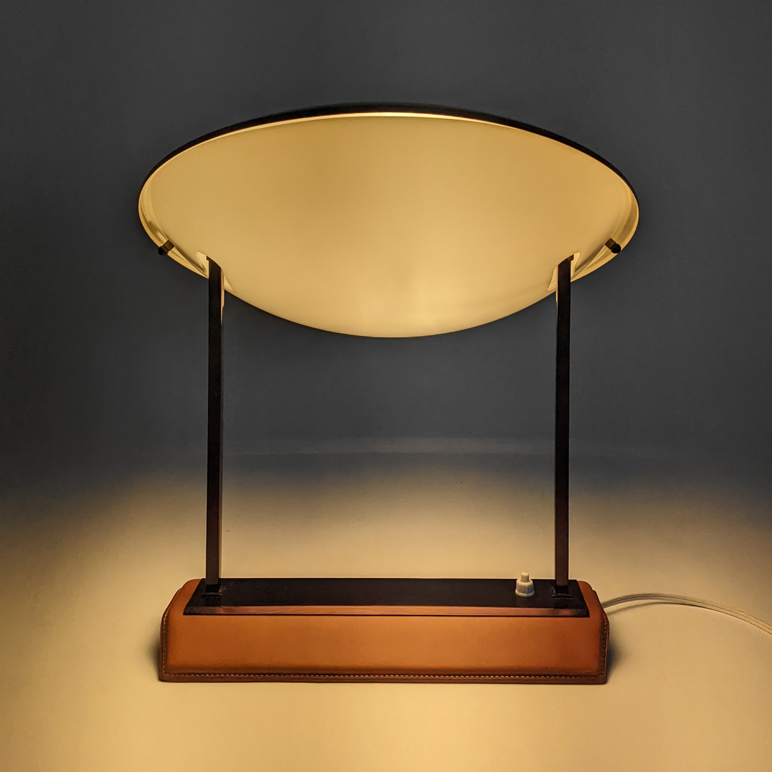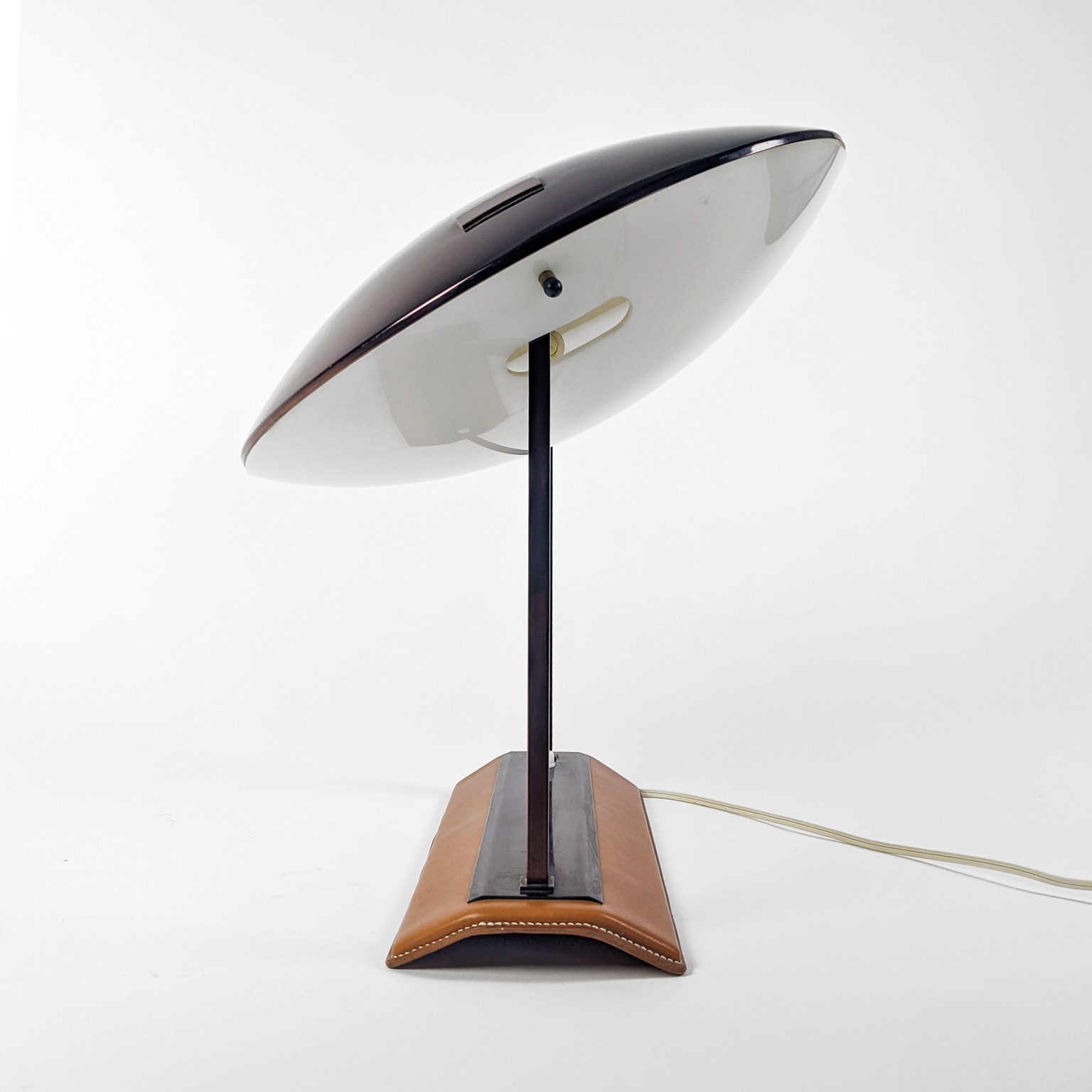 Lampe Stilnovo des années 60, modèle 8050. Un luminaire rare avec une coupole orientable et une base gainée de cuir gold.
