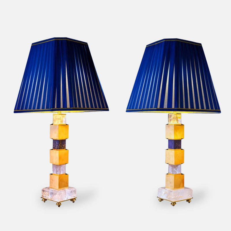 Paire de lampes de table en laiton, lapiz lazuli et cristal de roche. Accompagné d’artisans d’art, Alexandre Vossion assemble chaque pièce à la main dans ses ateliers parisiens, privilégiant toujours les matériaux d’exception.