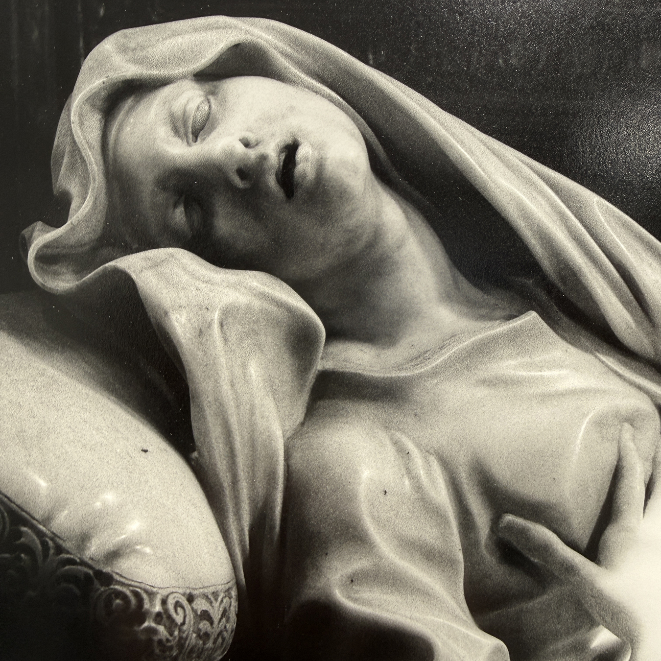 La lumière révèle la tension du corps abandonné dans l’extase spirituelle. Les plis tourmentés du drapé et l’intensité de l’expression sculptée par le Bernin semblent vibrer dans la pénombre de la chapelle.