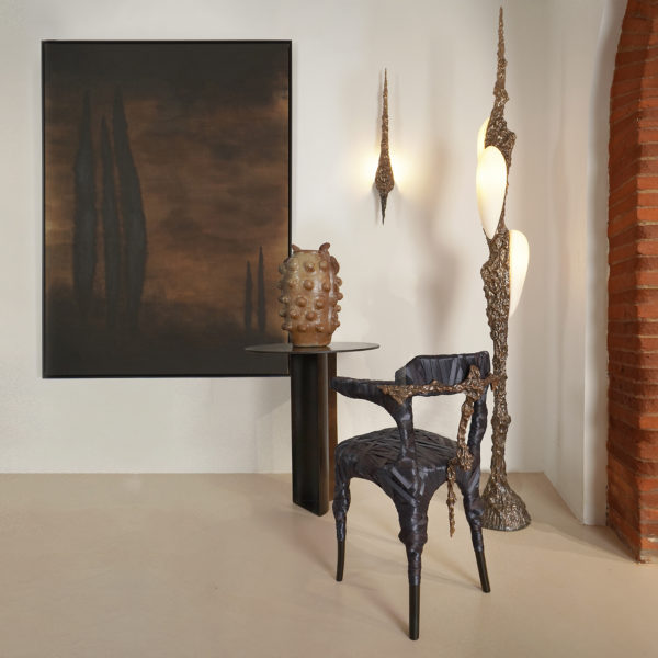 Inspiration : LV426 fait référence au nom de la planète visitée par l’équipage dans le film Alien. William est obsédé par l’espace et la science-fiction depuis qu’il est enfant. Les univers créés par HR Giger et Moebius ont eu un impact très fort sur sa vision, et c’est son hommage à eux. Avec cette création faisant référence à leur travail, il souhaite rendre leur univers accessible et éveiller la curiosité envers cette esthétique si particulière. Dans ces pièces, on pourrait voir des branches d’arbres tortueuses, ou même des raisins de fruits. Dans son esprit, c’est une interprétation de la créature de l’Alien. Cette collection dans toute sa complexité a nécessité plusieurs mois de développement. Chaque pièce est sculptée à la main par l’artiste avant d’être coulée en bronze dans une fonderie française. Toutes les pièces sont uniques et leurs formes, finitions (patine et polissage) peuvent être adaptées et personnalisées à la demande.  Cette collection comprend des lustres horizontaux et verticaux ainsi que des appliques.