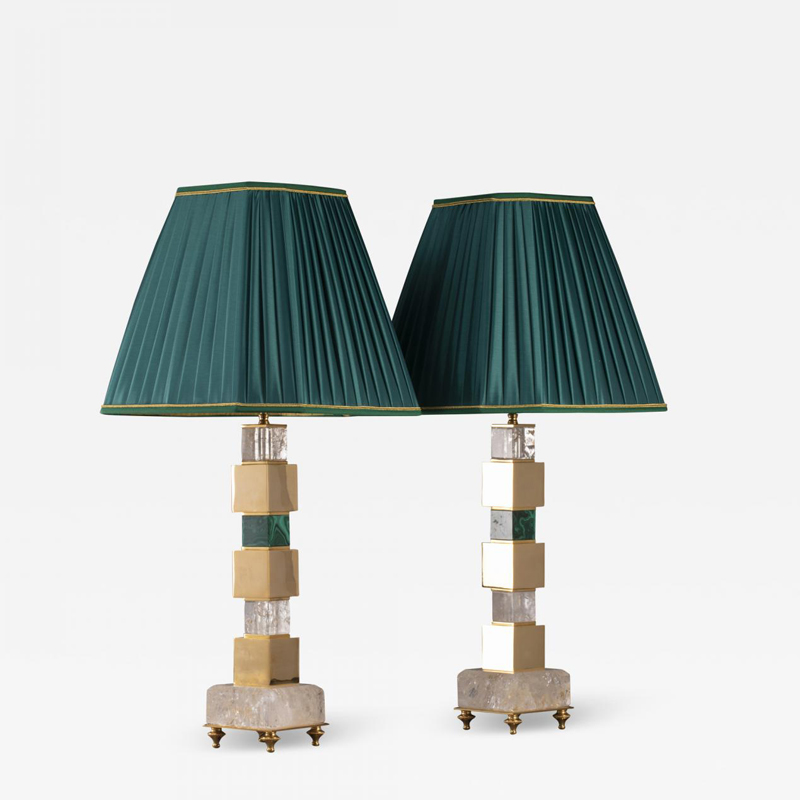 Paire de lampes de table en laiton, malachite et cristal de roche. Accompagné d’artisans d’art, Alexandre Vossion assemble chaque pièce à la main dans ses ateliers parisiens, privilégiant toujours les matériaux d’exception.
