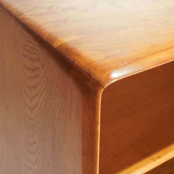 Description : Structure en chêne, patine d’époque, portes coulissantes en verre peint et aménagement intérieur avec un rayonnage re-positionable coté gauche, un compartiment à bouteilles en métal et deux tiroirs pivotants laqués côté droit.