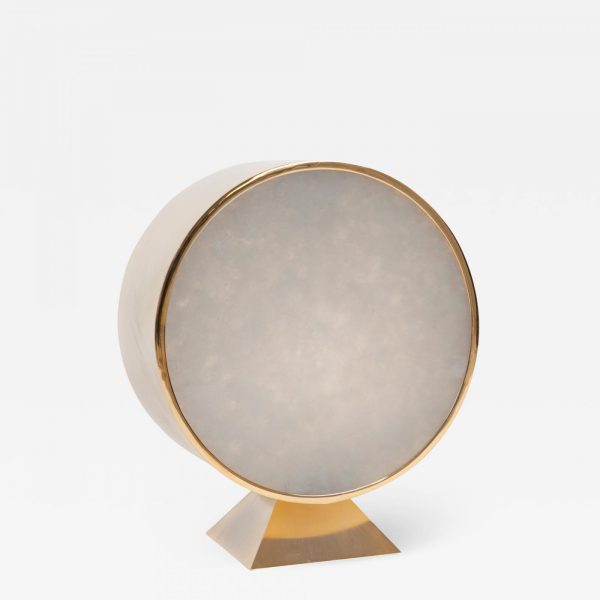 Lampe sculpture en verre coulé et laiton doré. Entouré d’artisans d’art, Antoine Vignault imagine et conçoit des luminaires d’exception, empreint de mythes et de légendes antiques, de géométrie sacrée et de matières fascinantes.
