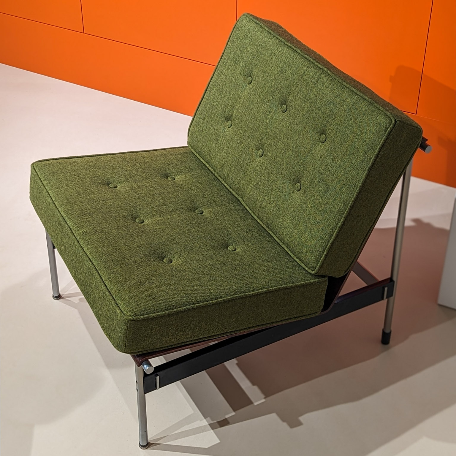 Paire de fauteuils conçus par Kho Liang Le pour Artifort en 1959. La structure est composée de lattes en palissandre, avec un piétement tubulaire en acier satiné et en métal noir. Les coussins en mousse ont été entièrement rembourrés et recouverts d’un tissu provenant de la Maison Gabriel. Ce modèle rare présente un design moderne qui associe à la fois élégance et confort.
