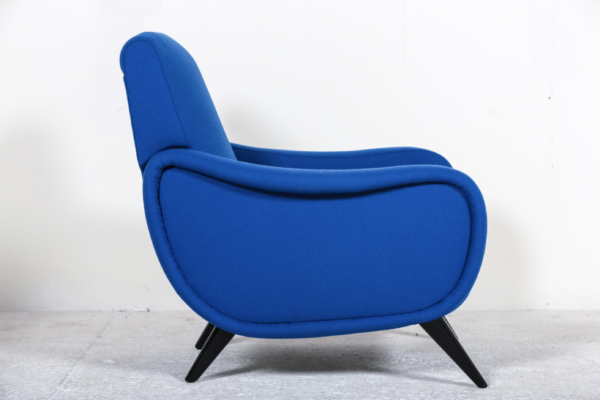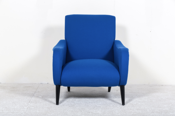 Paire de fauteuils vintage italiens des années 1950 entièrement restaurés, recouvert d’un tissu bleu électrique sélectionné chez Gabriel.