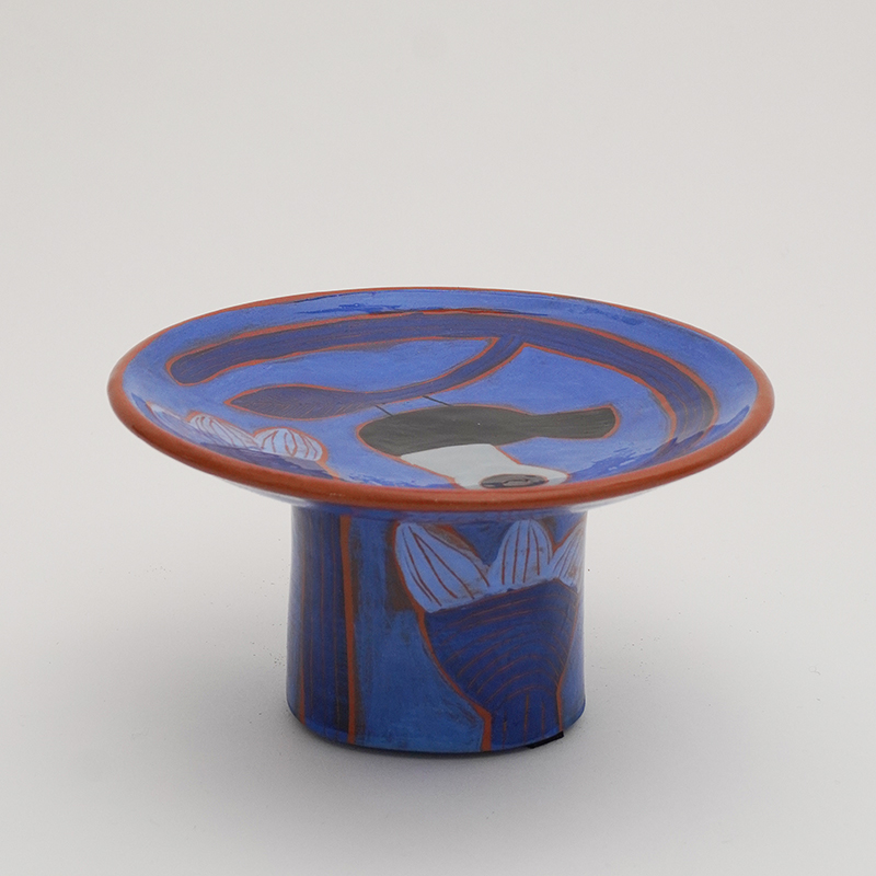 Petite coupe indigo décorée de motifs d’oiseaux, de fleurs et de feuilles. Une pièce unique réalisée à la main par Béatriz Garrigo, en céramique rouge émaillée bleu, gris et noir.