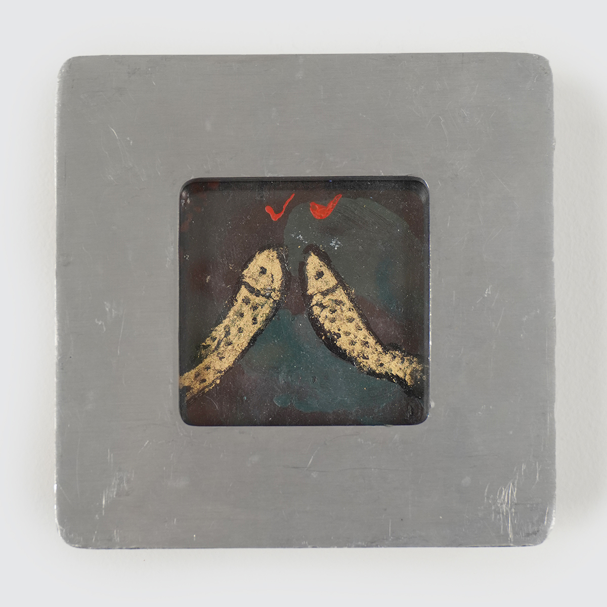 Huile sur carton de Corinne Tichadou représentant un deux poissons amoureux, dans un cadre vintage à poser.