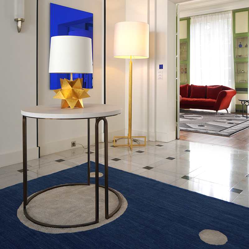 Guéridon en laiton massif patiné à la main. La feuille d’or apporte ses reflets satinés qui s’harmonisent avec le plateau de pierre de Bourgogne. Créé il a plus de 10 ans, ce guéridon est devenu un classique. Il a notamment été sélectionné par le Mobilier National pour entrer dans les collections du Palais de l’Elysée.