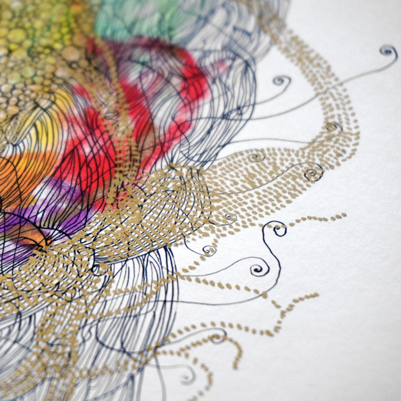 Tableau abstrait contemporain à l’encre et feutre réalisé par Marie-Pierre Biau. Une invitation à se perdre dans l’infini du cosmos ou dans les profondeurs sous-marines.