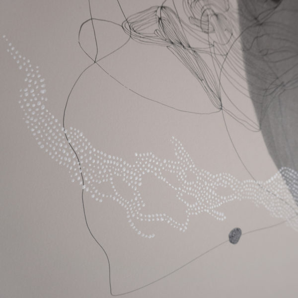 Ses dessins abstraits évoquent des univers infiniment petits comme autant de cartographies imaginaires. Elle nous plonge dans des mondes célestes ou subaquatiques , nous entraînant dans une contemplation sensorielle provoquée par son vocabulaire plastique fait de points, de lignes et de cercles .