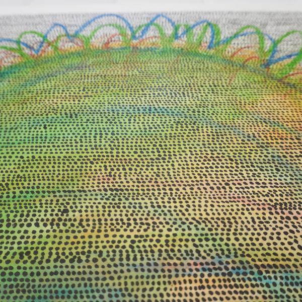 Inspiration : Par ses dessins abstraits, l’artiste nous plonge dans des mondes célestes ou subaquatiques, nous entraînant dans une contemplation sensorielle provoquée par son vocabulaire plastique fait de points, de lignes et de cercles