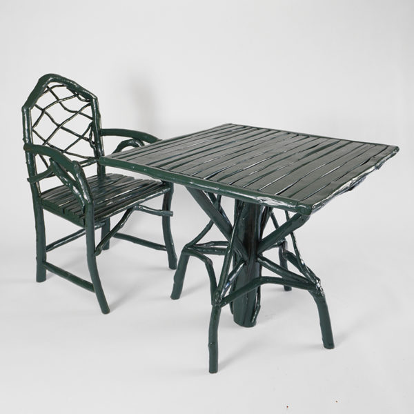 Matériaux : Table en bois laqué vert pour l’intérieur et l’extérieur.