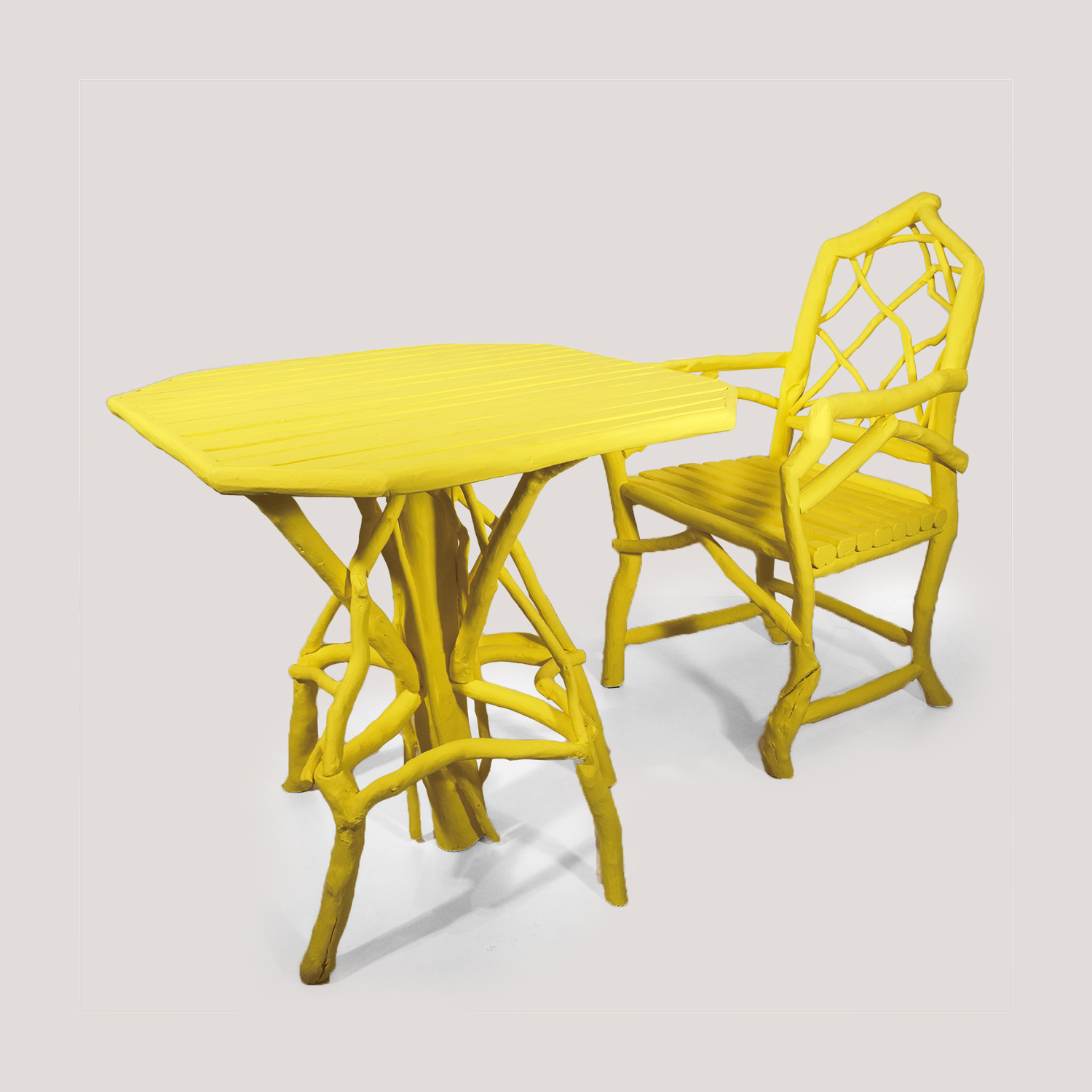 Matériaux : Table en bois laqué jaune mat pour l’intérieur et l’extérieur.