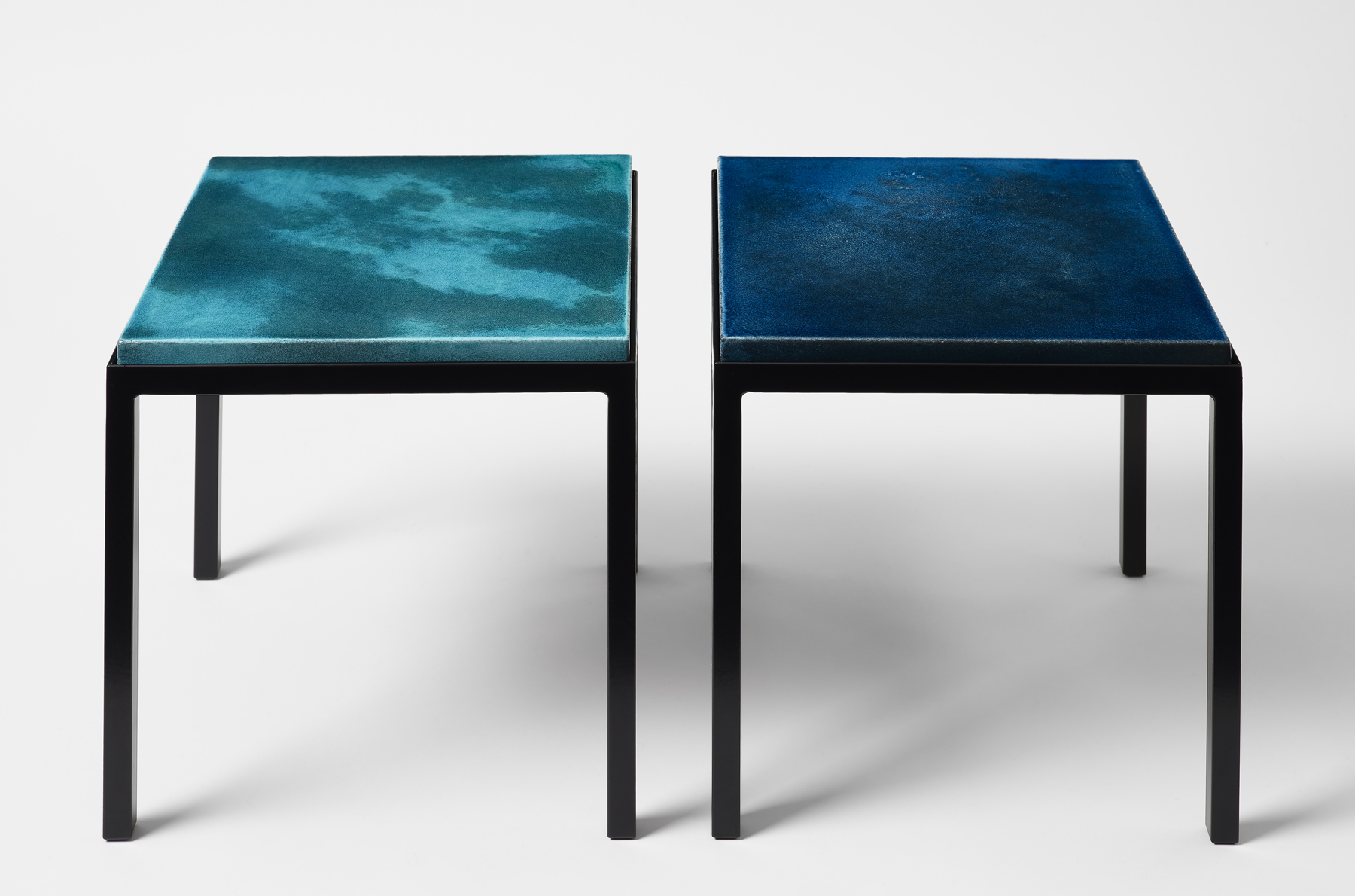 ​Paire de tables d’appoint ou bout de canapé. Plateau en pierre de lave émaillée, piétement en métal laqué noir.