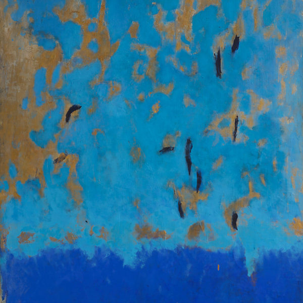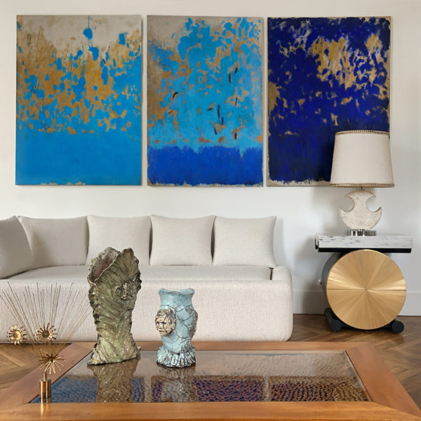 Peinture triptyque de Beatrice Pontacq en acrylique, dorure et argile sur toile de lin. L’artiste s’inspire d’éléments naturels reconnaissables pour créer des paysages et cartographies abstraites, qui posent la question du proche et du lointain, entre présence et absence.