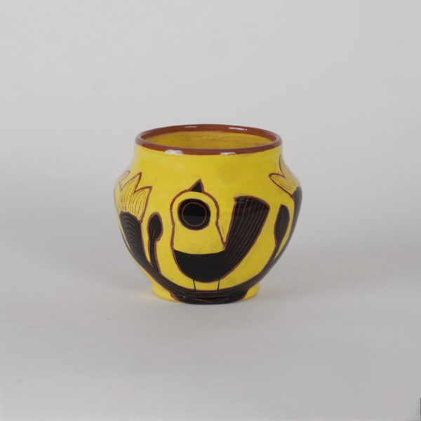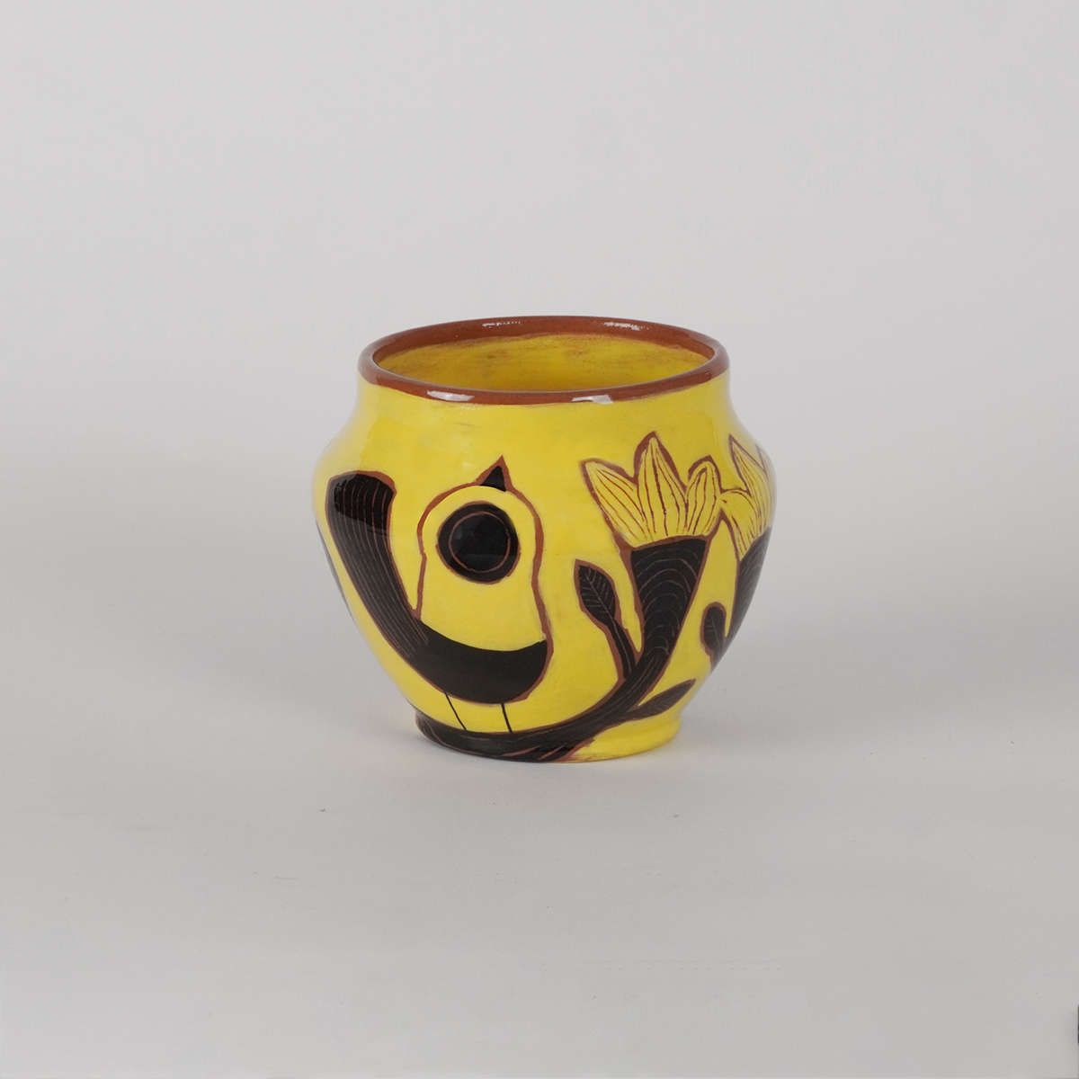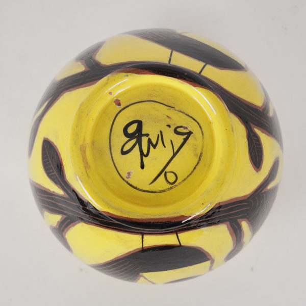 Vase boule jaune et noir en céramique rouge, émaillée et décorée de fleurs et d’oiseaux. Pièce unique, signée Béatriz Garrigo.