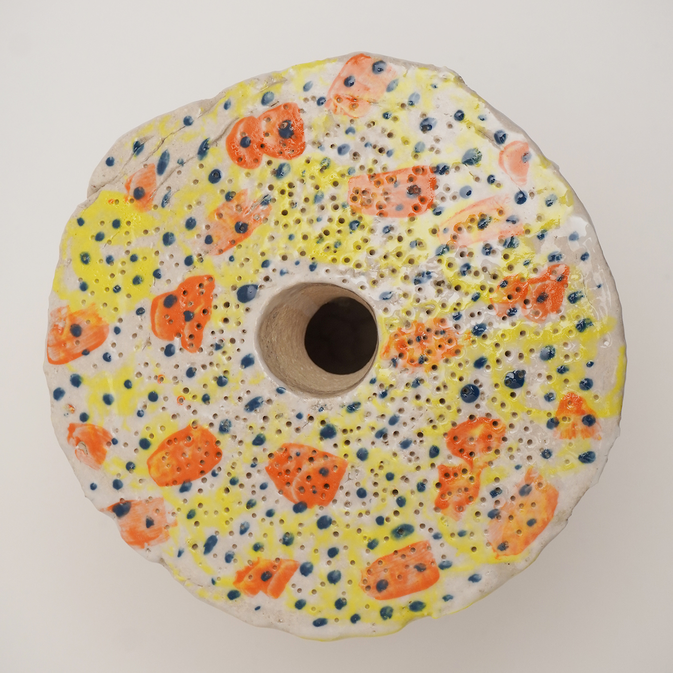 Inspiration :“Quand je travaille la terre ma règle de départ est le contenant (bol, vase, coupe …) . Souvent montée au colombin, quelquefois par extraction, la pièce se construit, dans un premier temps, à l’image d’une forme simple. La suite est plus instinctive, la terre me dicte l’enchaînement ; le colombin devient inachevé, crée des appendices au contenant de départ ; des pics, des percées , des volutes arrivent en derniers gestes de modelage. Sur le grès encore malléable je pose un décor d’oxyde ou d’engobes, points et lignes de couleurs qui dégoulinent sur elles-mêmes, ou petits points systématiquement appliqués au pinceau ou gravés dans la terre. Après la première cuisson je dessine souvent au crayon oxyde sur la pièce. Avant la cuisson définitive un émaillage partiel ou total vient étoffer la pièce, entre ombre et lumière. La règle de départ est respectée, le contenant a perdu son utilité, il est devenu objet sculpture. Mon envie n’est pas de chercher de frontière entre contenant et sculpture, seulement de trouver un équilibre entre la fonction et sa possible abstraction.”